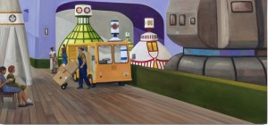Spectacle and the scale of sculptures are other interests of Lewis In the paintings Who’s Denise Please? and Not Only, But Also we see the playful treatment of an architectural-scale sculpture seen in two distinct yet complementary contexts. In the former, the focus lies on two intrigued viewers examining the piece. In contrast, the latter portrays a commercial retail environment where the interaction between the people within the composition becomes the focal point, rather than the sculpture itself.