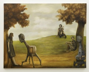 In this, his second show with the gallery, Lewis seems to be interested in the act of looking—not merely at the surface of his enigmatic sculptures, which we find depicted within the confines of a gallery, integrated into natural landscapes, or seemingly floating in space. But also with what the viewers in these charismatic paintings perceive about the inner lives of these sculptures.